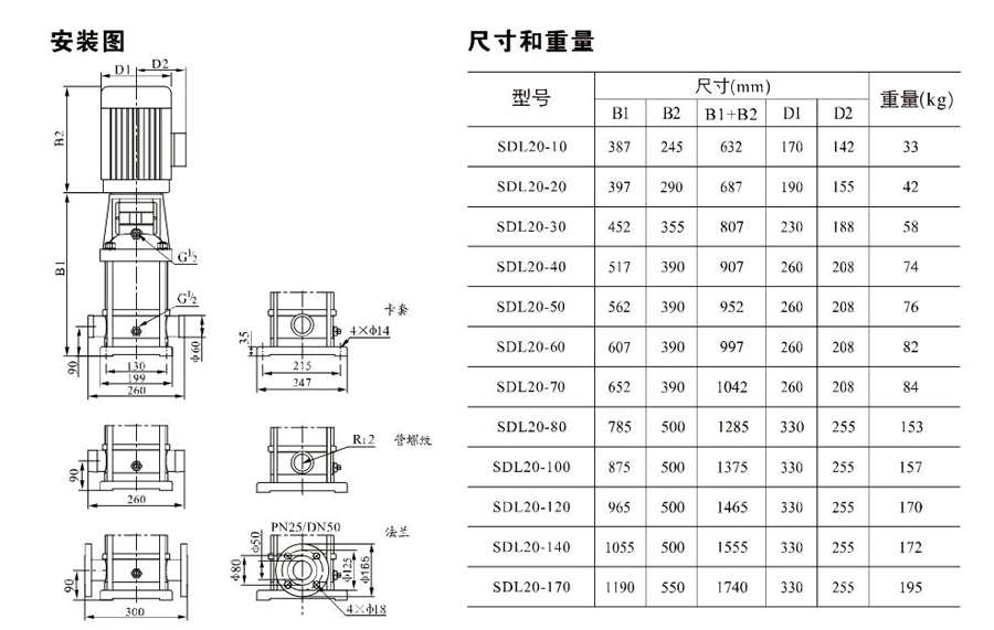 SDL20/SDLT20為配用標(biāo)準(zhǔn)電機的非自吸立式多級離心泵,電機軸和泵軸用聯(lián)軸器直接聯(lián)接,把拉桿用螺母將外筒,過流部件固定在支架和進出水體之間,泵進出水口在泵底部的同一直線上。泵可根據(jù)需要配置智能保護器,對泵的干轉(zhuǎn)、缺相、過載等進行有效的保護。